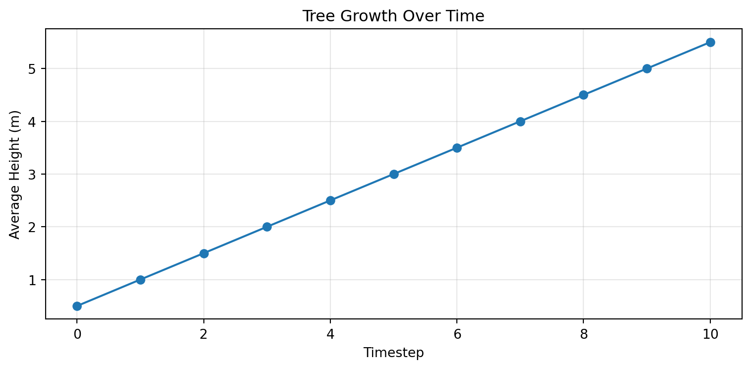 # Plot tree height over time (aggregated across patches)summary = df.groupby("step")["averageHeight"].mean().reset_index()plt.figure(figsize=(8, 4))plt.plot(summary["step"], summary["averageHeight"], marker="o")plt.xlabel("Timestep")plt.ylabel("Average Height (m)")plt.title("Tree Growth Over Time")plt.grid(True, alpha=0.3)plt.tight_layout()plt.show()