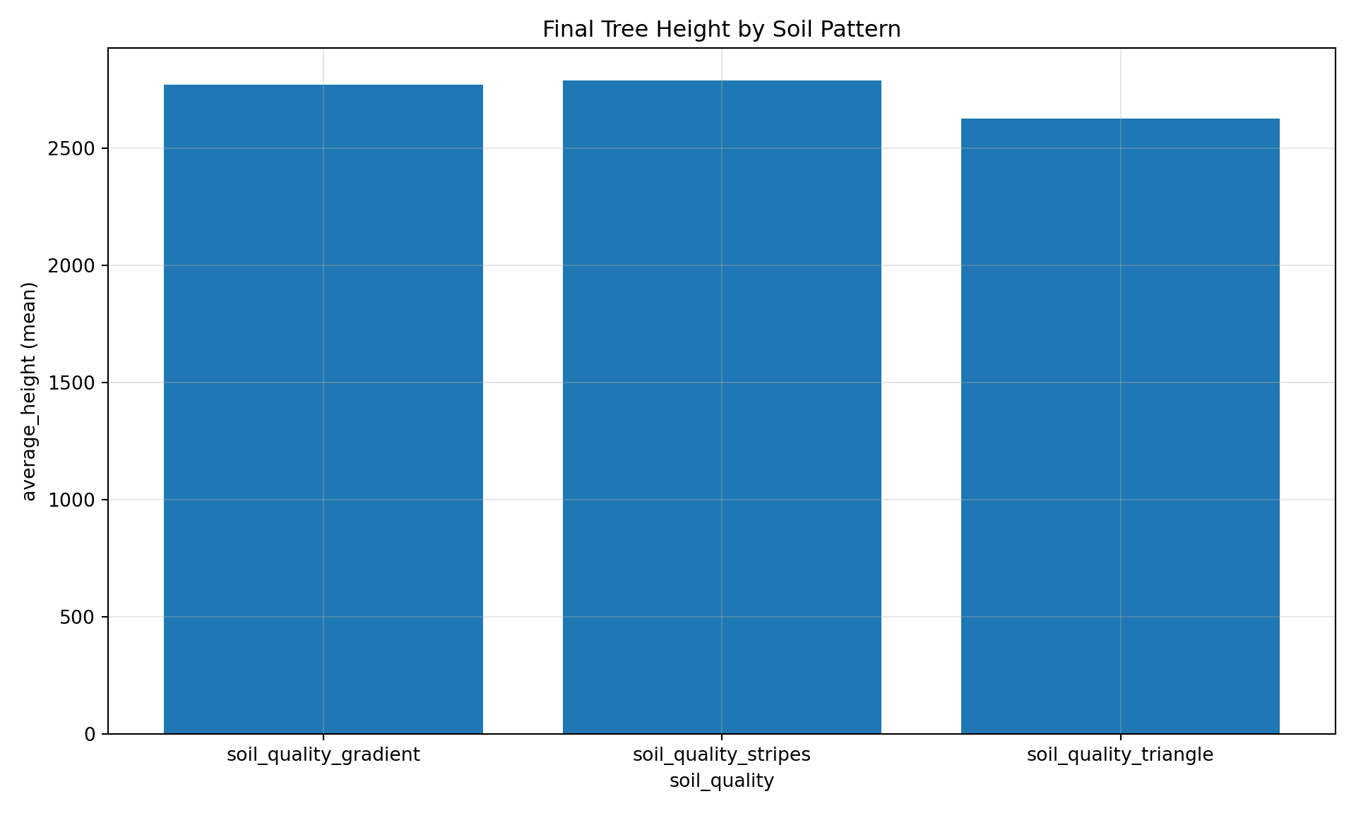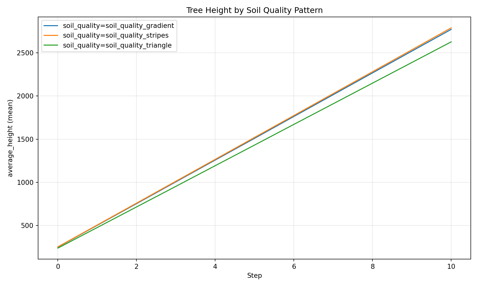 # Compare mean height by soil pattern# File parameter labels are stored in config_parameters, just like config paramsresult = manager.registry.query(""" SELECT cp.soil_quality as pattern, cd.step, AVG(cd.average_height) as mean_height, STDDEV(cd.average_height) as std_height FROM cell_data cd JOIN config_parameters cp ON cd.run_hash = cp.run_hash GROUP BY cp.soil_quality, cd.step ORDER BY cp.soil_quality, cd.step""")result.df().head(15)