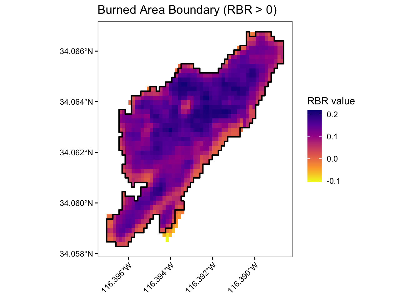 labs(title = "Burned Area Boundary (RBR > 0)", x = NULL, y = NULL) +